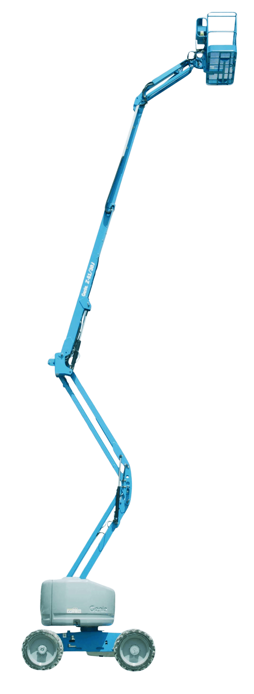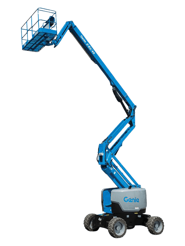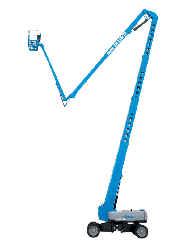 Eine Gelenkteleskoparbeitsbühne ist eine äußerst flexible Maschine, die den Vorteil der seitlichen Reichweite bietet. Wie alle Hebebühnen ermöglicht sie Ihnen den sicheren, effizienten und bequemen Höhenzugang. Die Hebevorrichtung ist ausfahrbar und ähnelt dem längenverstellbaren Mast einer regulären Teleskop-Arbeitsbühne. Die Besonderheit von Hubsteigern dieser Art liegt in dem Gelenk, das in den Mast integriert ist. Der gewollte Knick in der Hebevorrichtung erweitert den Einsatzradius deutlich. Sie können den Arbeitskorb nicht nur senkrecht in die Höhe heben und ihn schwenken, sondern auch eine waagerechte Seitenbewegung ausführen. Dabei ist der Mastabschnitt parallel zum Boden ausgerichtet, um den Arbeitskorb über Störkanten hinwegzubefördern. Diese sogenannte Übergreifhöhe unterscheidet sich je nach Gerät und hängt unter anderem von der Anzahl der Gelenke in der Hebevorrichtung ab. Diesel-Gelenkteleskopbühnen werden von einem kraftvollen Verbrennungsmotor angetrieben und erreichen Höhen bis zu 50 m. Unter den Gelenkteleskoparbeitsbühnen sind sie die Variante mit der größten vertikalen Reichweite.